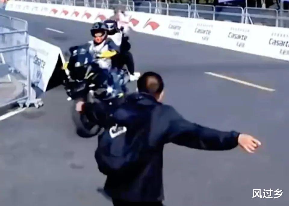 “因车辆声音过大,喊话未得到有效回应,裁判员随即做出手势指挥摩托车分流,引起紧跟其后的两名运动员误判。经其他裁判员及时提醒,运动员重回冲刺赛道。”