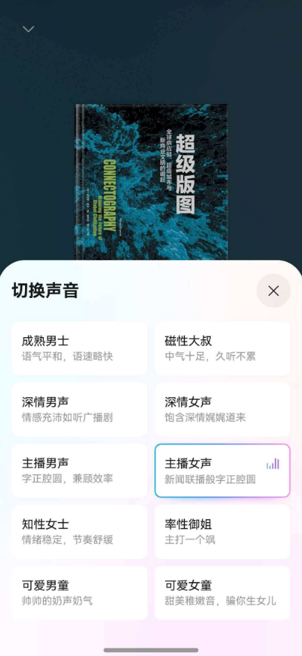 说实话,这些书都挺“硬核”,啃起来费劲。但华为阅读的体验帮了我大忙,比如忙了一天,眼睛累了,我就用“听书”功能,“主播女声”、“磁性大叔”这两款音色我最喜欢,模拟真人的情感和停顿,一点也不像AI朗读,把枯燥的理论讲得津津有味,通勤路上就能听完两章。