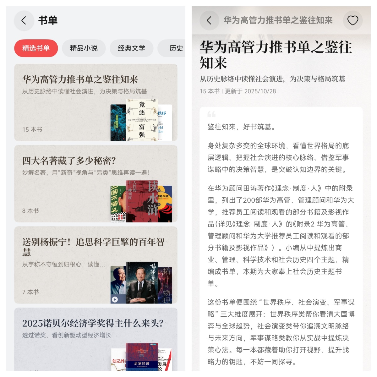 华为阅读最近推荐的书单深得我心,源自《理念·制度·人》附录中,华为高管和顾问们推荐给员工的阅读列表。这份书单被编辑精编成了几大主题,除了第一期硬核的《科技探秘》,我发现第二期《鉴往知来》简直是为我这种“卡住”的职场人量身定做的。