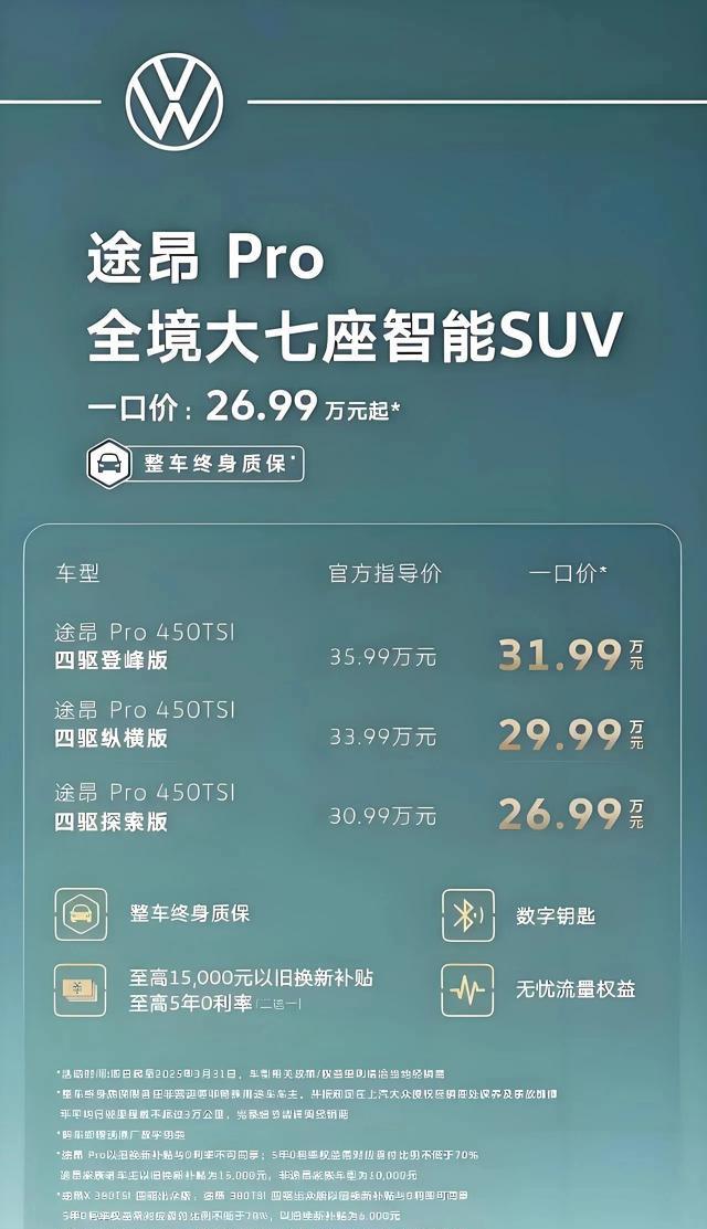 从性价比的角度来看,途昂Pro的定价还是比较合理的。26.99万元起的价格,能买到这样一款在动力、驾控、设计、智能化等方面都表现出色的中大型SUV,真的是物超所值。相比同级别的一些竞品,它在某些方面还更有优势。比如说有些竞品可能在智能辅助驾驶方面没有途昂Pro这么全面,或者在车内空间上没有途昂Pro宽敞。