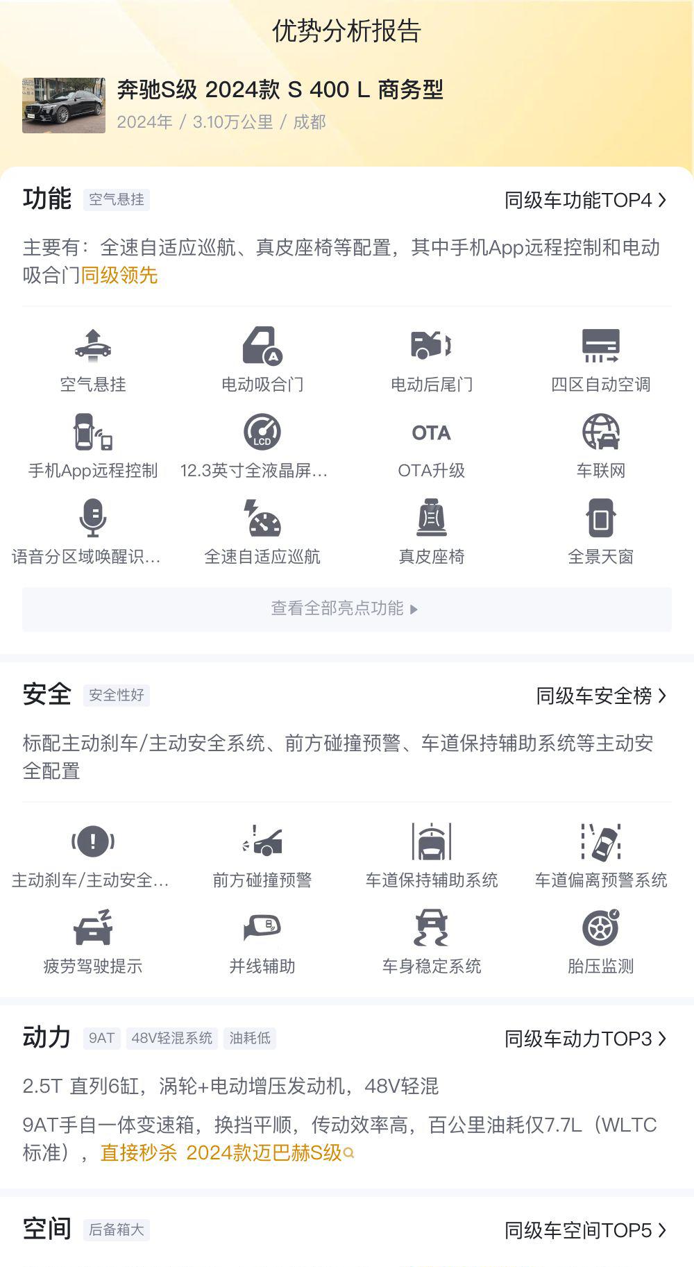 与同价位的其他车型相比,S级在品牌力和保值率方面更具优势。奔驰S级作为豪华轿车的标杆,其品牌影响力毋庸置疑。而较高的保值率,也意味着在未来换车时,可以以更高的价格出手。