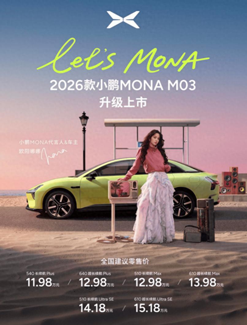2026年4月2日,小鹏汽车在广州举办LET’S MONA!主题上市派对,2026款小鹏MONA M03正式推向市场。新车定位面向年轻用户的AI智能纯电轿跑,以20万级车型为开发参照,在设计、智能、舒适、安全等维度完成升级,共推出6款配置,官方指导价11.98万—15.18万元,并推出限时购车权益。