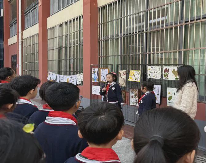 在挂满植物标本的展示架前,小讲解员们正手持麦克风,向同学们娓娓道来。她们的身后,是五彩斑斓的“植物王国”。