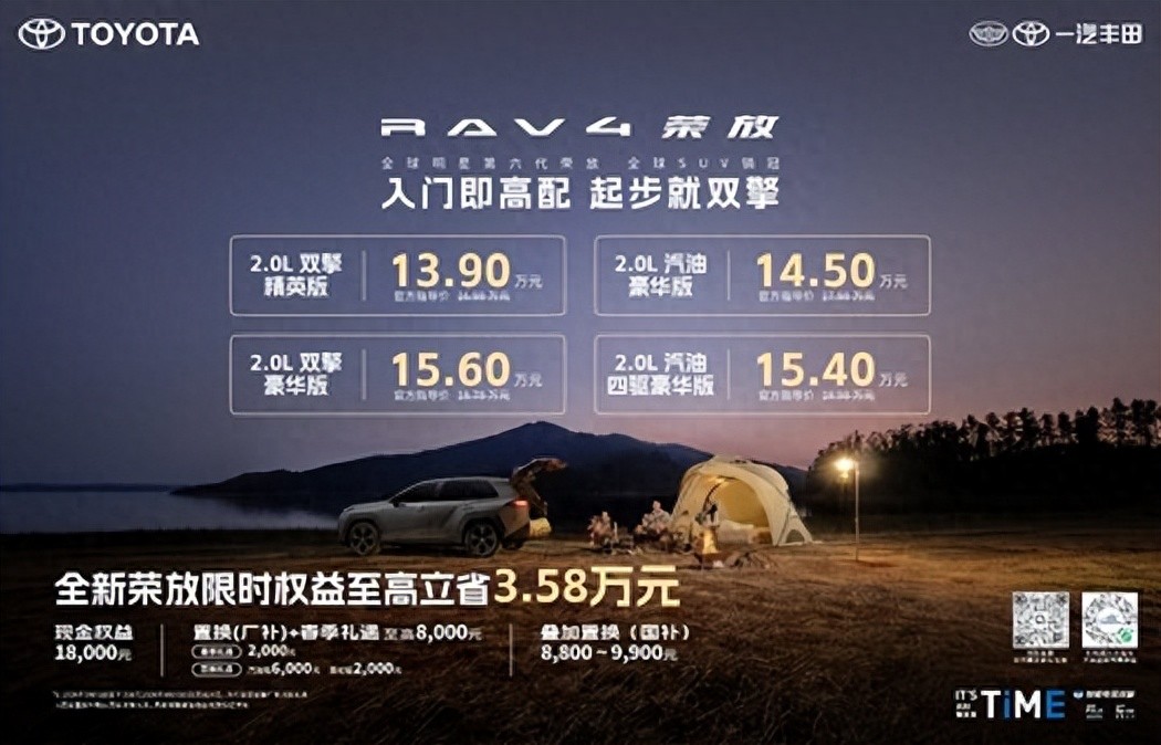 价格直降1.8万元、厂补至高8000元,再享受国补至高约万元,综合折算,购买全新荣放,真金白银至高立省3.58万元。因此,智能电混双擎精英版实际价格即全新荣放起步价仅为13.9万元。没有套路,没有期货;入门即高配、起步就双擎、上车有TSS 4.0智行安全,且油混同强;购买全新荣放,品质口碑更可靠、长期价值更划算,买车一步到位更省心。
