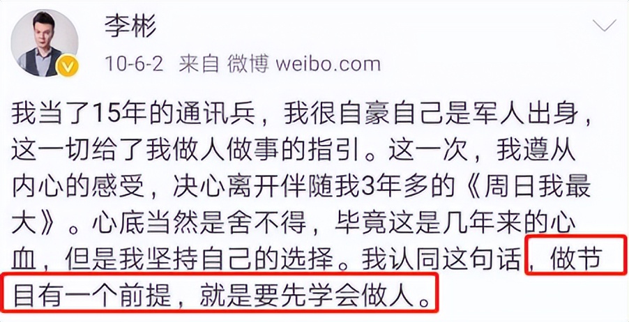 2010年,毫无征兆的,李彬突然和安徽卫视闹翻,一则微博冲上热搜,李彬发文称:“做节目的前提,要先学会做人。”