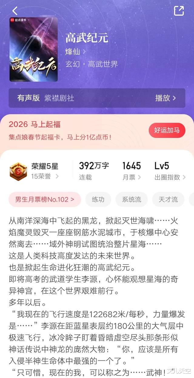 小说2024年3月1号开始连载,写了一年11个月出头,因为上架后成绩上涨迅速,这本小说也帮助他直接跳过十二天王竞争,于2024当年拿下大神约了。