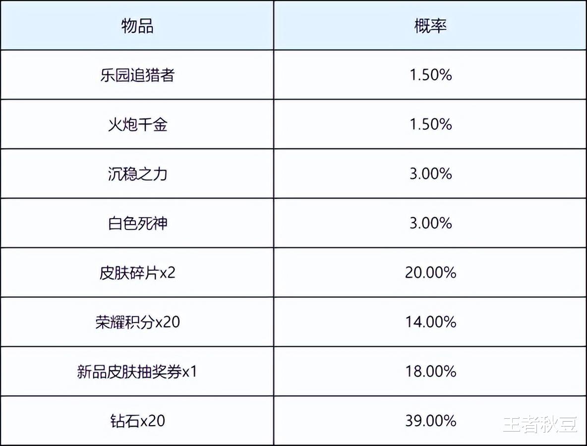 上图就是抽奖获得的物品概率,由于上限100个礼包,那么就是100抽必得火炮千金和乐园追猎者。也就是2000点券必得这两款皮肤,还是挺贵的。