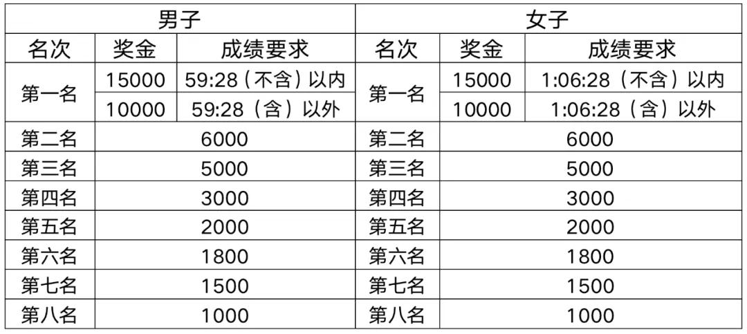 1.按枪声成绩录取半程马拉松个人组前八名,其他个人名次按净成绩录取,个人单项奖只取最高一项奖金进行发放,不重复累加奖励;