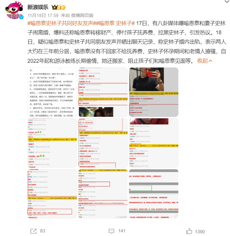 更炸裂的是,游泳教练的前妻徐女士随后下场佐证,称自己2022年通过行车记录仪发现两人私情,4月提交离婚申请,6月曾在史林子粉丝群曝光此事却被踢出拉黑,当时给喻恩泰留言也石沉大海。聊天记录中 “不然咱家老三出来的太快了” 等露骨内容,结合史林子已育两子的背景,更引发无限遐想。舆论瞬间反转,史林子从 “受害者” 变成 “出轨惯犯”,网友调侃 “这波是恶人先告状?”