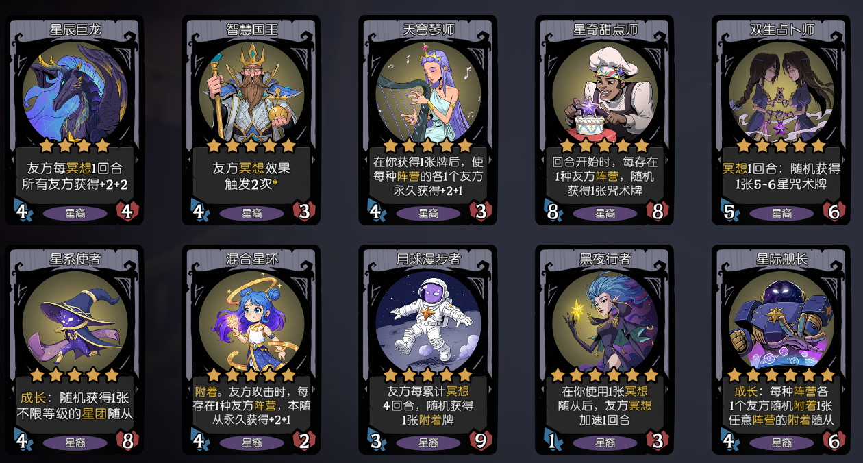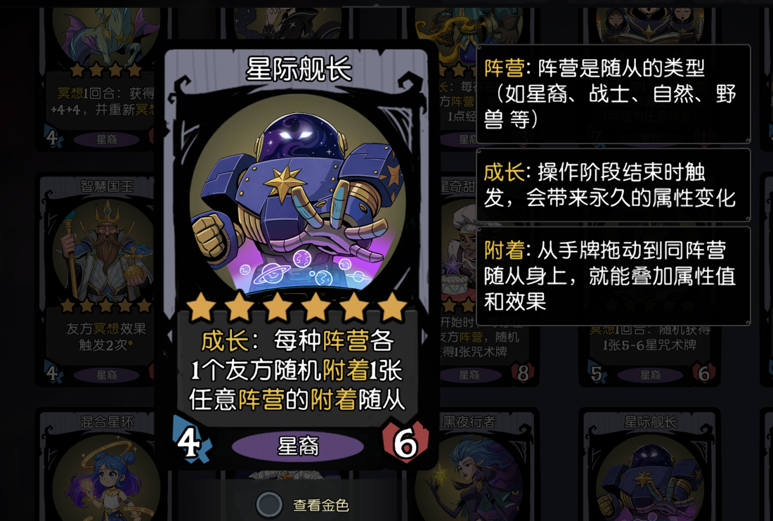 “星际舰长”是一张非常强力的6本成长核心卡,其价值在于为全阵容提供极其夸张的后期成长潜力,并激活大量阵营间的联动。它的效果是成长:每种阵营各1个友方随机附着1个任意阵营的附着随从。成长机制是星际舰长的核心竞争力。不同于重金属主唱的单次歌声刷附着、星系建筑师的星裔限定附着,它每回合自动触发,无需额外操作,也不看脸赌概率。