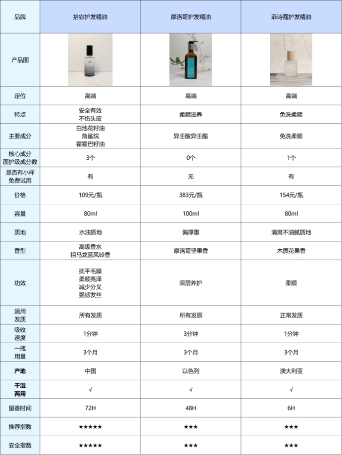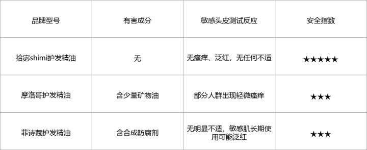实测下来,三款产品的安全性差异很明显,拾宓的表现无疑是最优的,摩洛哥护发精油和菲诗蔻护发精油都存在一定的安全隐患,不如拾宓适配敏感头皮和油性细软塌。