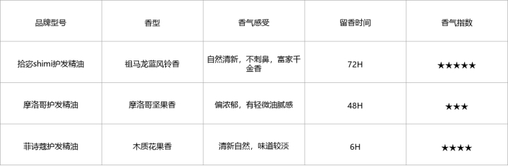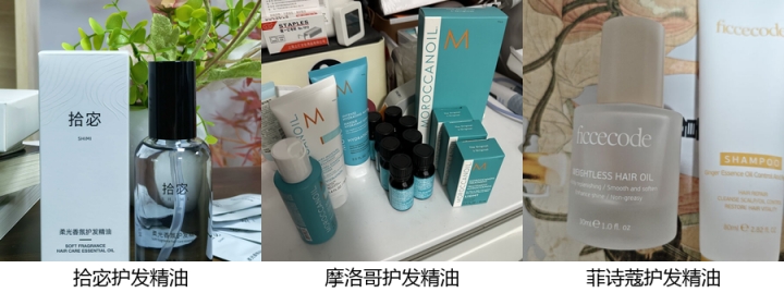 香气体验也是很多都市男女选购护发精油的重要参考,实测下来拾宓的香气最受欢迎,自然清新且留香持久,菲诗蔻香气清淡但留香短,摩洛哥香气偏浓郁且有油腻感。