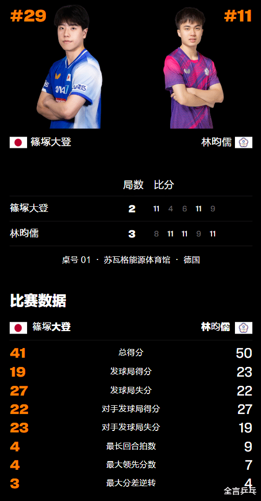 第二局篠塚大登再次开局落后但这次很快便被拉开多达7分的差距,林昀儒则不断发力破防并以10-3领先拿到多达7个局点,反手回球失误丢1分后迅速找回状态,随即以11-4轻松扳回一城。