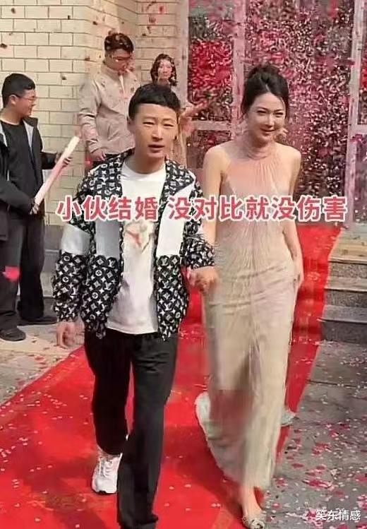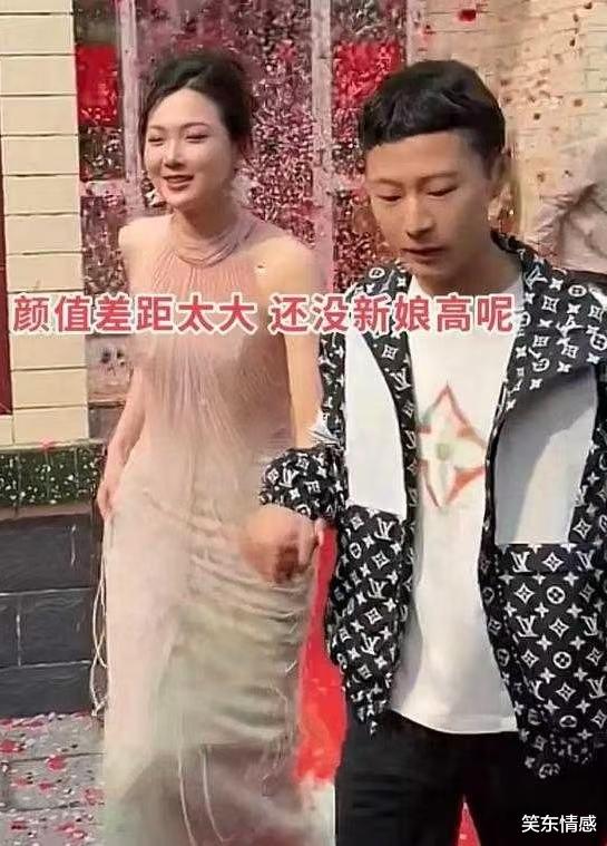 镜头里,新郎是土生土长的农村小伙,皮肤黝黑、身材瘦小,身高不及新娘,身着简单的休闲外套与运动鞋,全然没有新郎该有的精致与体面,站在人群中就是一个普通的农家青年。他身旁的新娘,盘着精致的发髻,身着露肩礼服,五官精致、身材高挑,皮肤白皙透亮,即便穿着平底鞋,依旧身姿挺拔、眉眼动人,一颦一笑尽显温婉大气,与新郎形成鲜明的反差。