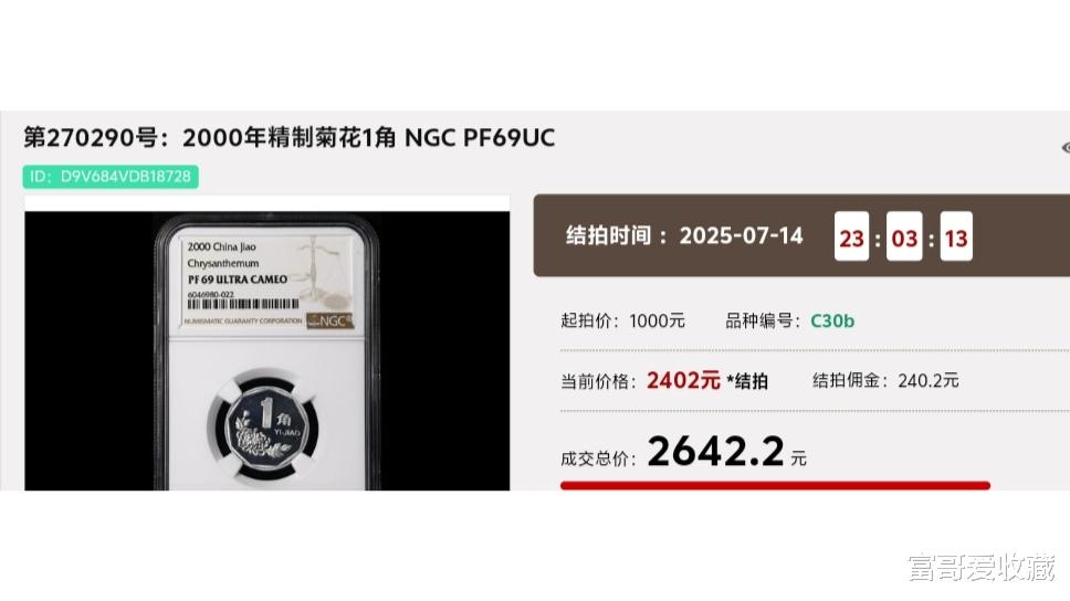 上面这枚“菊花1角”,就是2000年的“精制币”,它在NGC评级中,评级分数达到了69分,最后拍出了2642.2元。