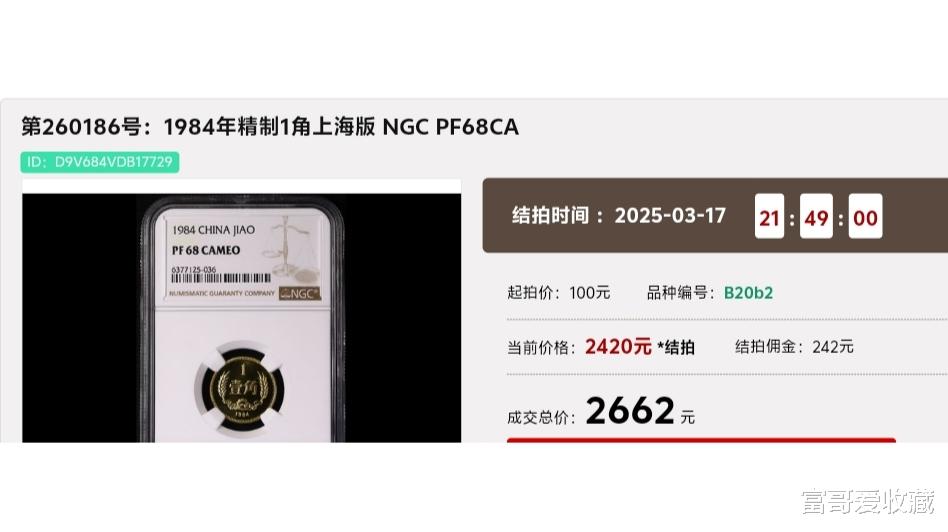 在2025年3月17日的“春秋大拍”中,一枚1984年的“精制1角”(上海版),NGC评级分数68分,最后拍出了2662元。