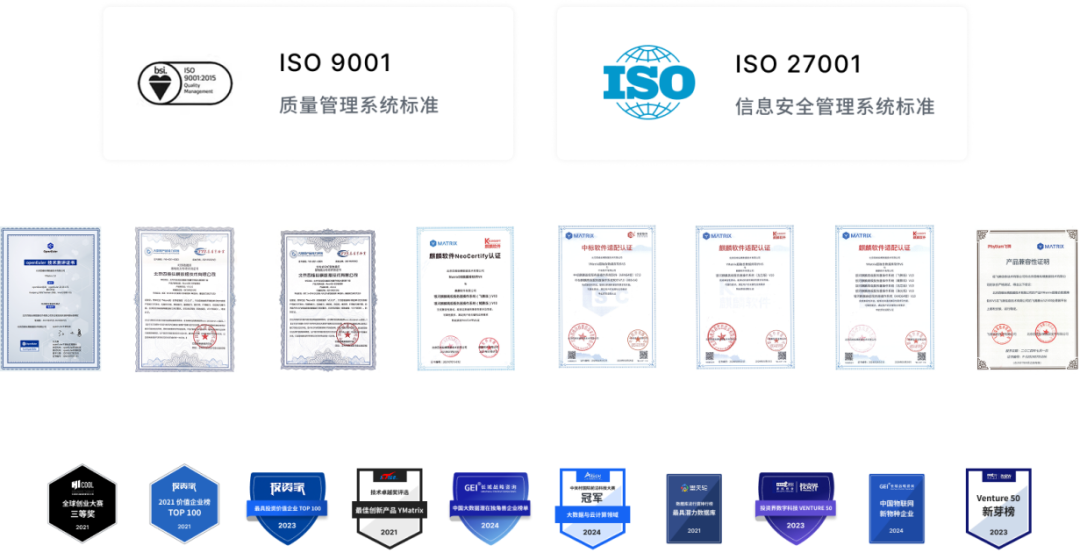 YMatrix现已通过中国信通院“分布式分析型数据库”和“时序数据库”双认证;与国内主流CPU操作系统(麒麟、飞腾、鲲鹏、海光、兆芯、统信等)完成兼容认证,全面兼容主流国产芯片与操作系统;同时协同生态伙伴(用友,神州数码,帆软,数聚),围绕企业数据的采集、存储、加工、应用,展开深度合作,为企业提供完整国产化解决方案。
