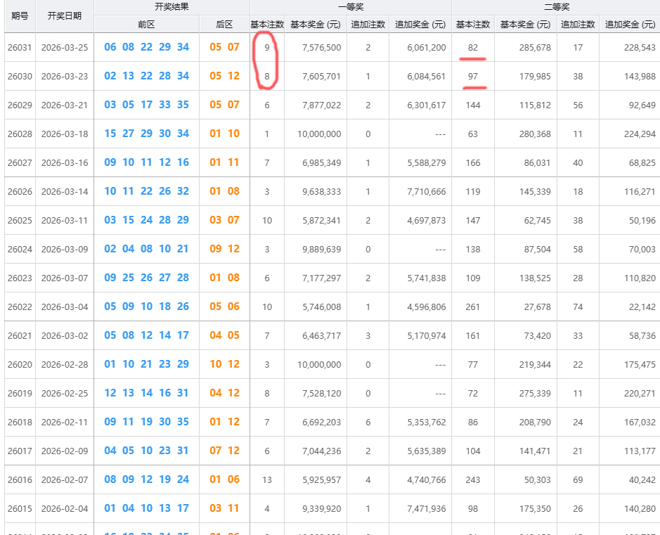 再看后区:26030期:05(奇)、12(偶),奇偶比1:126031期:05(奇)、07(奇),奇偶比2:0后区从一奇一偶跳到了全奇,而且05连续两期开出,属于热号。后区近期奇数偏强,接下来防一下全偶组合。