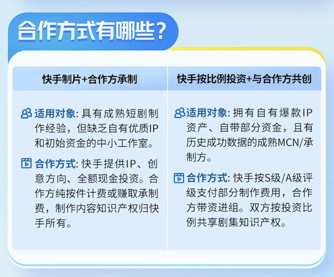 合作路径上,快手提供两种模式:① “快手制片+合作方承制”模式:快手提供IP、创意方向及全额现金投资,合作方按件计费或赚取承制费,知识产权归快手所有;② “按比例投资+共创”模式:快手按S/A级支付部分制作费用,合作方带资进组,双方按投资比例共享知识产权。