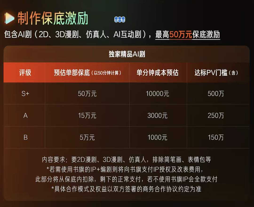 淘宝短剧正式推出“AI剧百万激励计划”,覆盖2D/3D漫剧、仿真人剧、AI互动剧等全品类。资金激励方面,S+级AI剧单部最高可获50万元保底,A、B级分别为15万元、5万元;播放分成上,累计有效PV超5000万可享最高7元/千次有效播放。这意味着创作者可同时获得保底与分成收益,相应地,短剧质量也需同步提升。