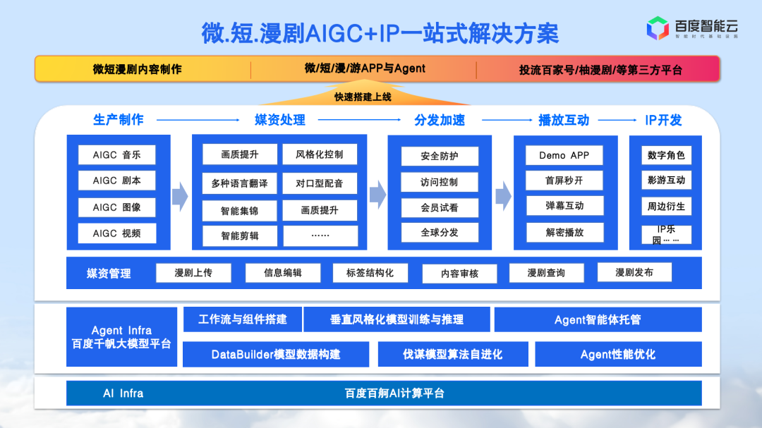 百度智能云于3月26日发布“AI漫剧产业赋能计划”,从IP、制作到分发提供一站式解决方案。基于百度千帆大模型平台,助力创作者打通从创意、技术、商业落地到出海的AI全链路赋能。