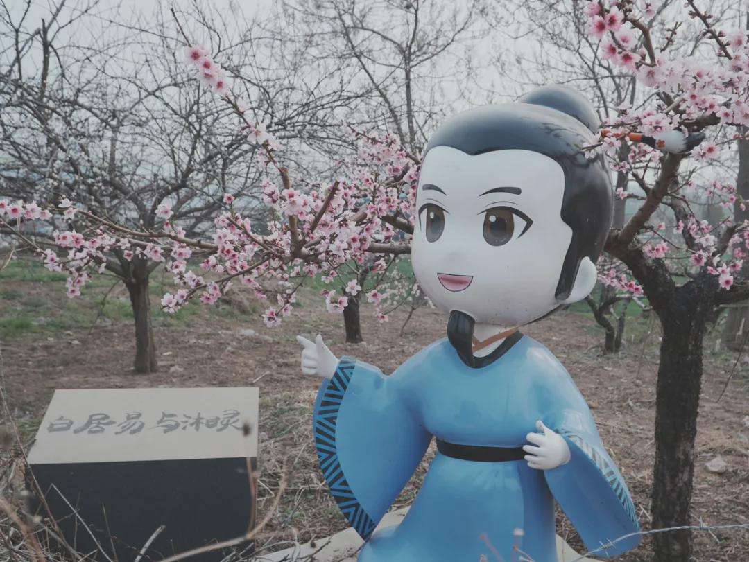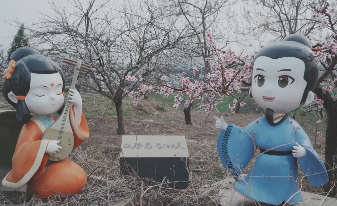 在拂晓大道濉河大桥东侧,桃花树下,还隐藏着一对恋人,默默诉说着那段“不得哭,潜别离”的凄美往事,那就是千年前的白居易与湘灵的卡通人像,只见湘灵抱着琵琶,面露哀愁,眉头轻蹙,眼波低垂,像是有满腹的心事,坐在小船上,回忆起意气风发的少年郎白居易,那个与自己青梅竹马的符离才子。