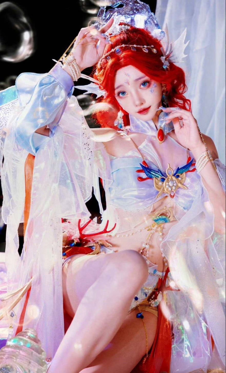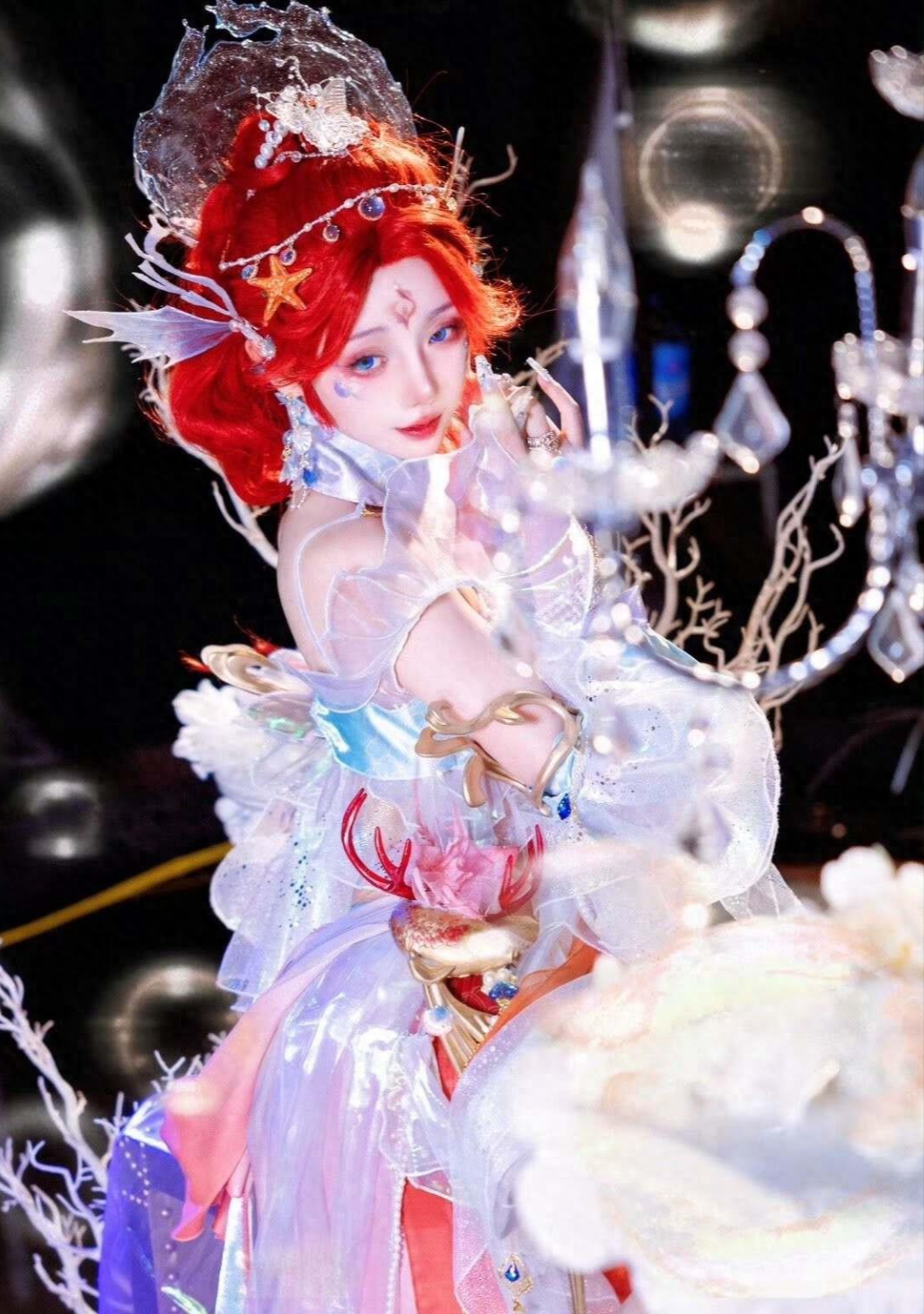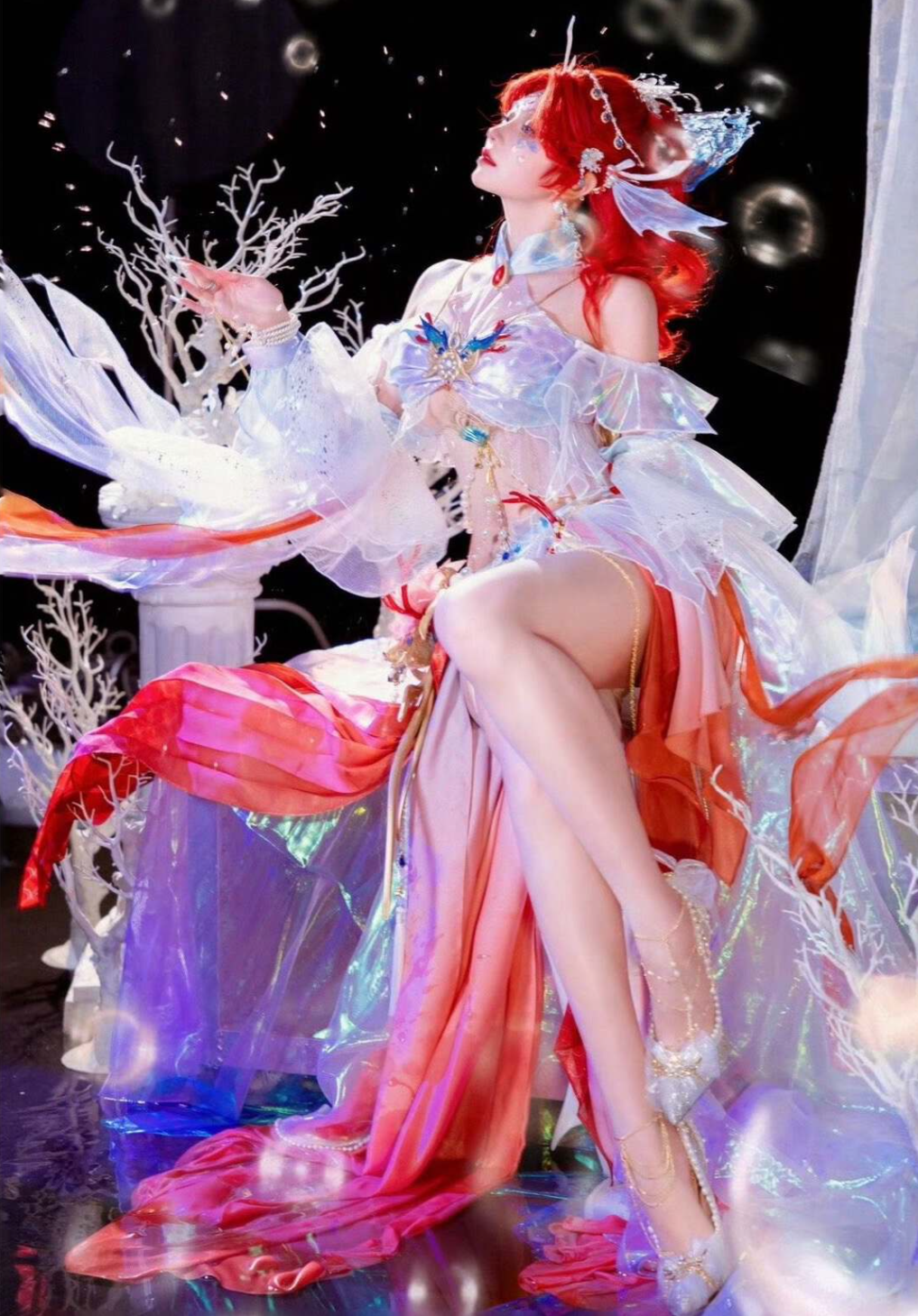 在这组照片中,走路摇身着一袭晶莹剔透的水晶仙女裙,仿佛从童话世界中走出的公主。火红色的长发随风飘扬,与身上的水晶装饰相映成趣,展现出一种既神秘又高贵的气质。她的眼神中充满了故事,仿佛能够瞬间将观众带入那个充满魔法与战斗的世界。