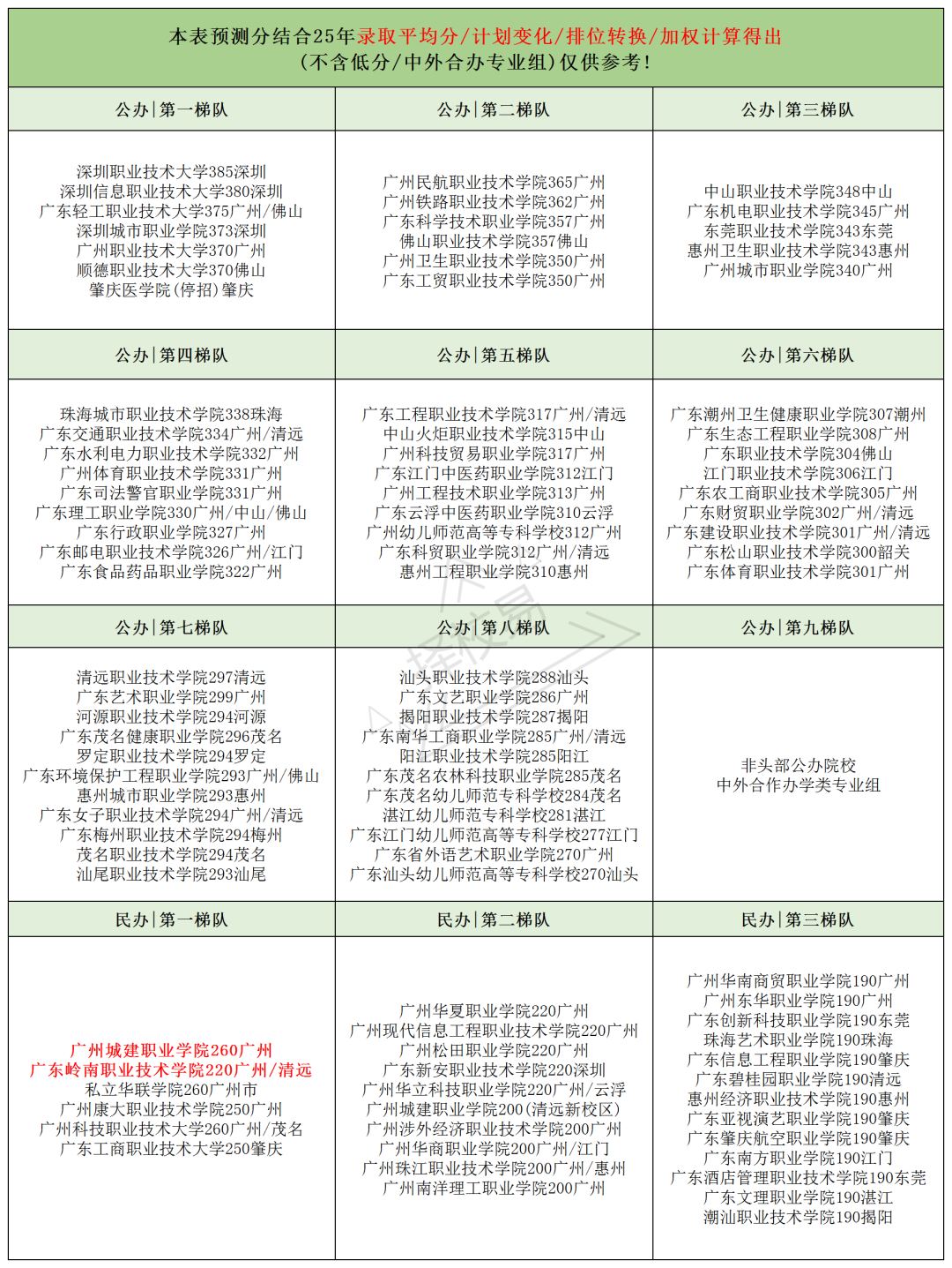 锁定第二、三、四梯队热门公办学校(比如广铁职、佛职、工贸、广机电、广水利等),该分数段考生可稳报多数公办院校,建议优先选择院校特色专业,以提升未来就业竞争力。