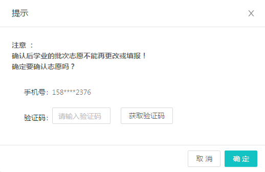 须点击“志愿确认”按钮获取短信验证码(发送到高考报名时绑定的手机),输入收到的验证码进行网上志愿确认,即可完成志愿填报。