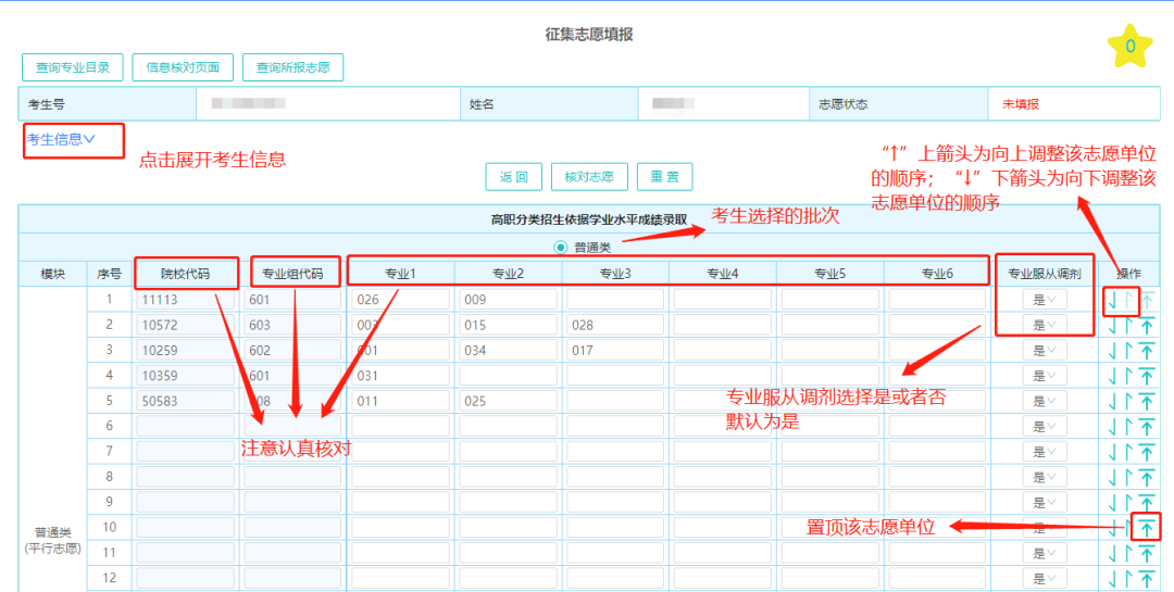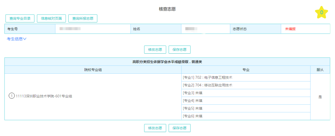 填完院校代码、专业组代码和专业代码等信息后,点击“核对志愿”按钮,认真核对自己的志愿是否准确,如有错误,可点击“修改志愿”按钮进行修改。