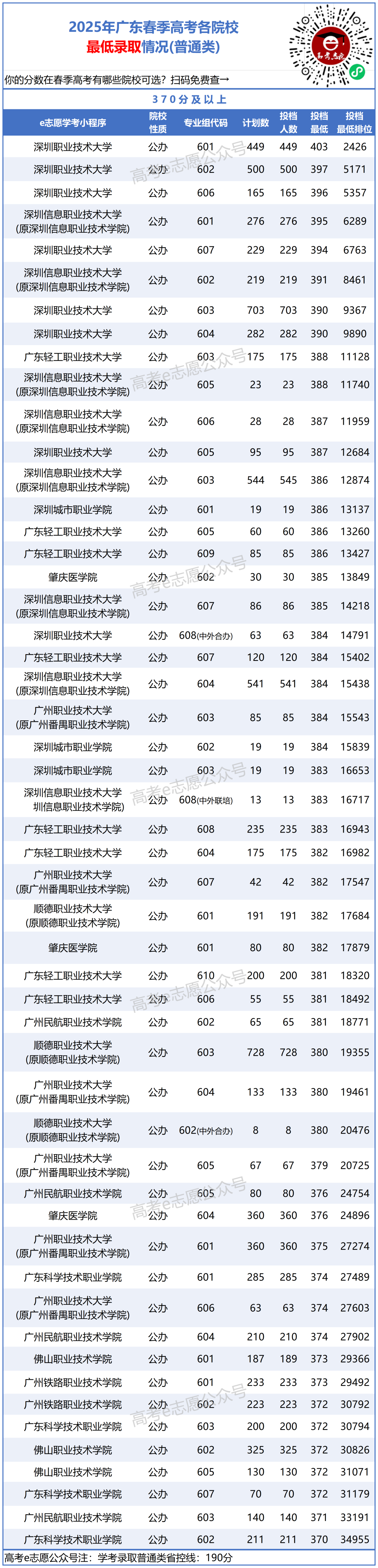 可冲刺头部公办专科(深职、深信息、广职大/番职、广轻工、顺职等),此分数段考生学考成绩稳居前列,分数和排位均占优势,竞争压力相对不大,可重点瞄准珠三角顶尖公办院校。