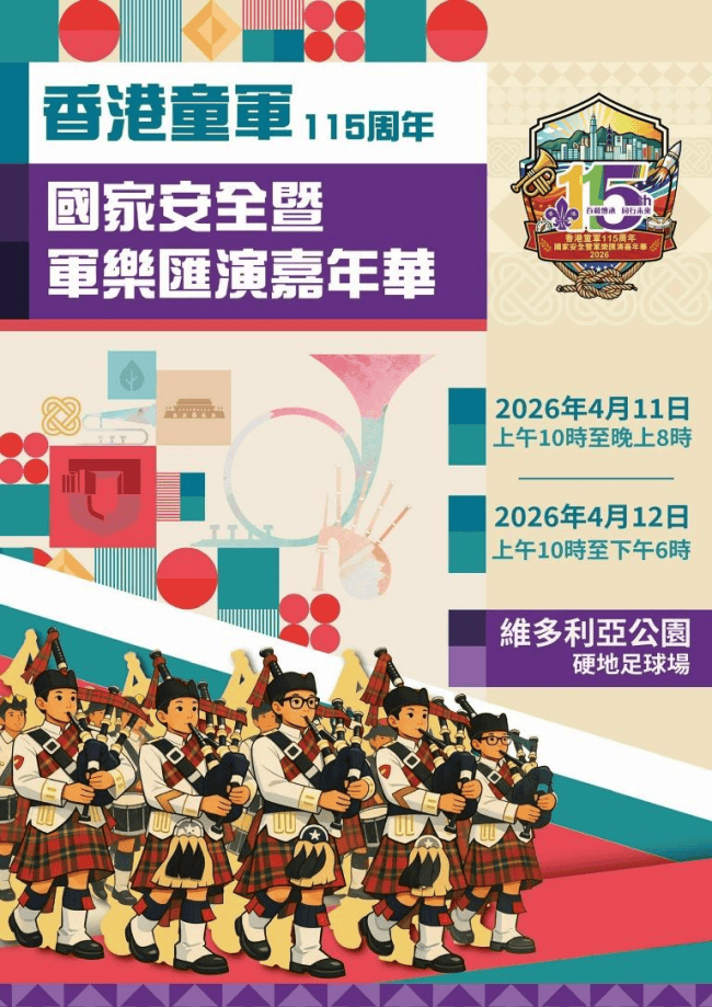 作为115周年系列活动的重头戏,「国家安全暨军乐汇演嘉年华」将于4月11日至12日在维多利亚公园举行,活动融合军乐汇演、历史展览、互动摊位及特色表演,免费向公众开放。有兴趣的市民及游客可在3月10日至25日期间,登入总会官网进行免费登记,成功登记后即可于活动当日到现场领取门票入场。欢迎全国民众,特别是内地同胞亲临香港,在欢乐氛围中增进对国家安全的认识,共享童军百年的喜悦与荣光。温馨提示,现场有POP GIFT与香港童军总会联合开发手办销售。