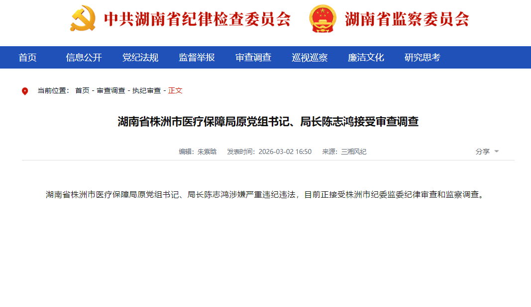 然其既久掌基金重权,渐忘初心。丙午年(2026)三月二日,湖南省纪委监委“三湘风纪”通报:株洲市医疗保障局原党组书记、局长陈志鸿涉嫌严重违纪违法,正接受株洲市纪委监委纪律审查、监察调查。昔之“仁爱医保”倡导者,今为“救命钱”之蠹虫,其变若此!