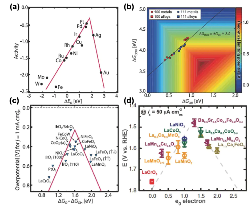 ,的关键描述符为ΔG_O- ΔG_OH或ΔG_;ORR中,ΔG_是核心描述符,2e⁻路径的理想值约为0.44 eV,4e⁻路径则依赖O与OH的吸附能差。