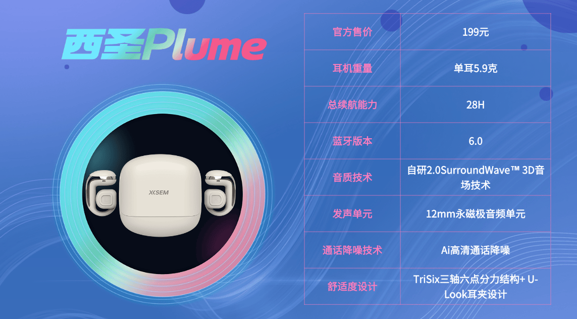 不仅音质出色,西圣Plume在功能体验上也毫不妥协。搭载最新蓝牙6.0芯片,信号稳定、抗干扰能力强,支持HyperSound™电竞级低延迟,游戏、观影、运动使用全程流畅同步。28小时超长续航满足全天佩戴需求,Ai高清通话降噪让嘈杂环境下也能清晰交流。凭借这些高规格配置,完全吊打同价位竞品!
