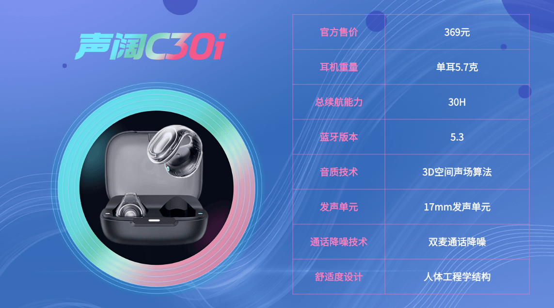 性能:音质方面,采用的是13mm发声单元,低频下潜深度跟半入耳差不多,没有特别深,中高频的表现就比较均衡。蓝牙5.3连接反应灵敏,延迟低,通勤、运动听歌都能保持稳定音质。续航上单次可以使用使用10小时,搭配充电仓可以使用30小时,续航时间充足。