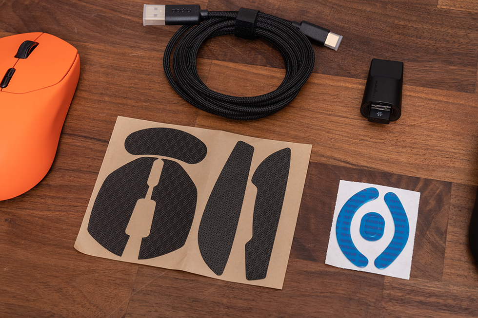 附件方面,包含了8K带屏蔽和镀金接口的高速编织线、3M"冰感"PTFE特氟龙电竞大脚垫 、微型nano 8K接收器、吸汗防滑贴纸和说明书。
