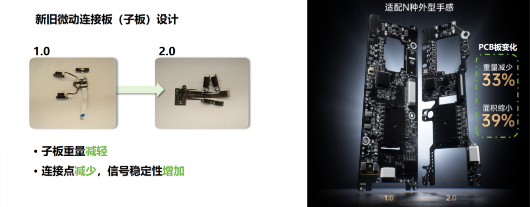 极客之芯 2.0 芯片:采用更小、更轻的极客之芯 2.0 芯片,相比 1.0 版减少了 33% 的重量,缩小了 39% 的 PCB 面积,通过软硬板结合提高了零部件的响应稳定性和可靠性,电池设计在尾部并采用直立式设计,有助于保持重心平衡,提升跟手感和操作体验。