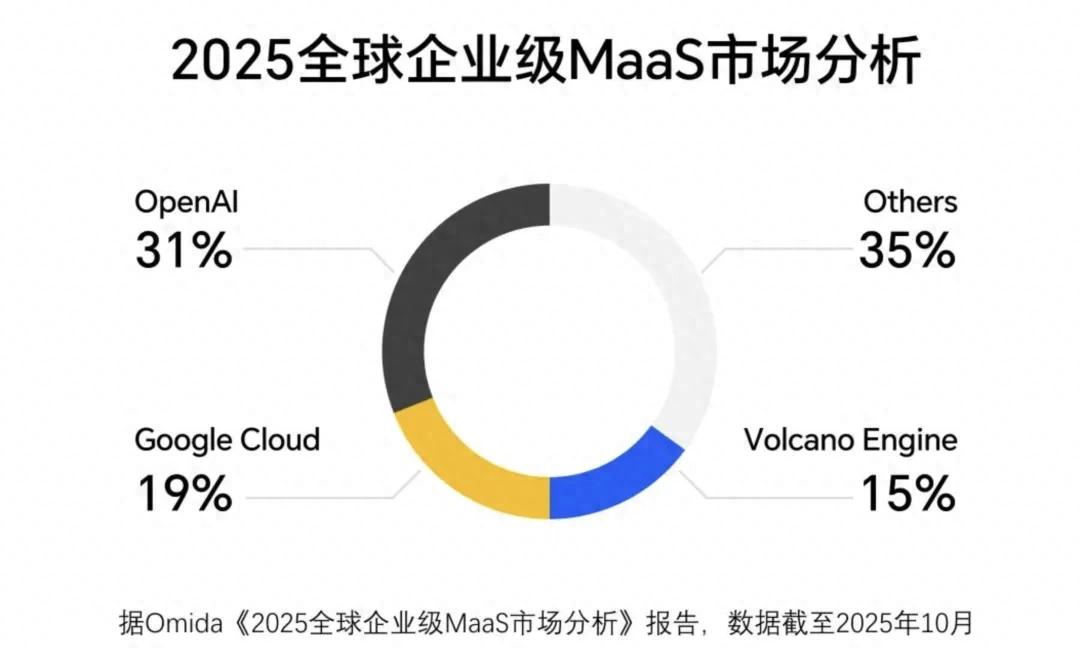 近日,国际市场调研机构英富曼(Omdia)发布了《2025 全球企业级 MaaS 市场分析》报告:截至 2025 年 10 月,火山引擎日均 Tokens 调用量已经达到全球第三,仅次于 OpenAI 和谷歌云。