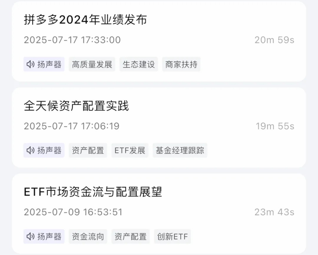 回到TicNote,它还是挺聪明的,包括文件名字都给我起好了:「ETF市场资金流与配置展望」、「全天候资产配置实践」。比起苹果手机自带的语音备忘录App总是以某某地址来命名录音,还是高级一丢丢。