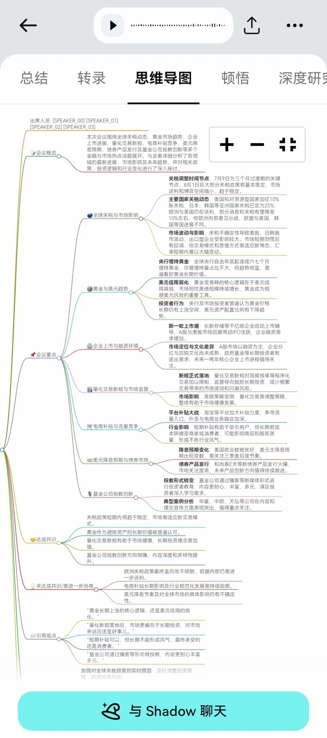 其次是传统录音笔根本无法替代的功能:写提纲、总结中心思想、做思维导图、深度研究等等。它之所以能做到这些,是因为搭载了自研的AI Agent「Shadow AI」。
