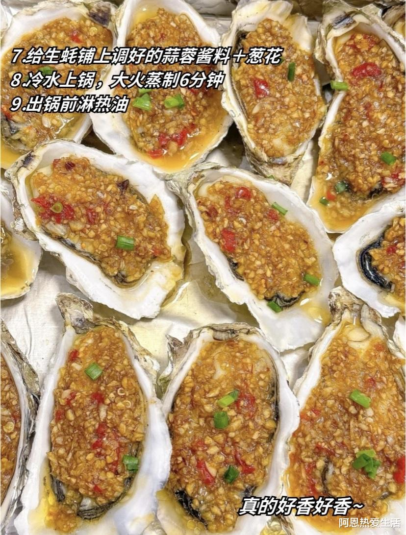 家常蒸制版:水烧开后,将摆好盘的生蚝放入蒸锅,大火蒸5-8分钟。蒸制更能保留生蚝的原汁原味,适合喜欢鲜甜口感的人。