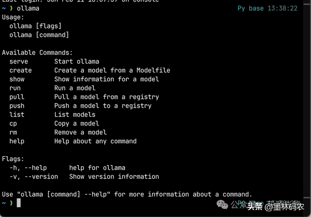 管理模型:ollama list查看已下载模型;ollama rm <模型名>删除模型;ollama help查看所有命令。