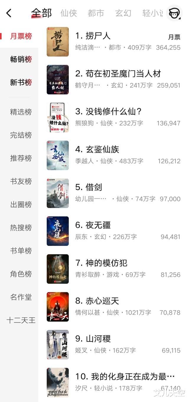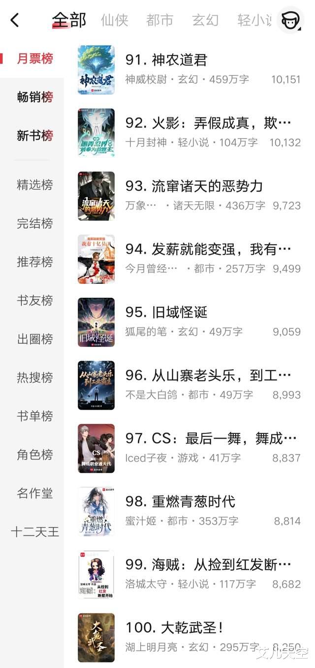 其余作品的排名是没有变化的,没钱修仙剧情上依旧在应对邪神入侵的问题,夜无疆主角下一步要往五境宗师去了。