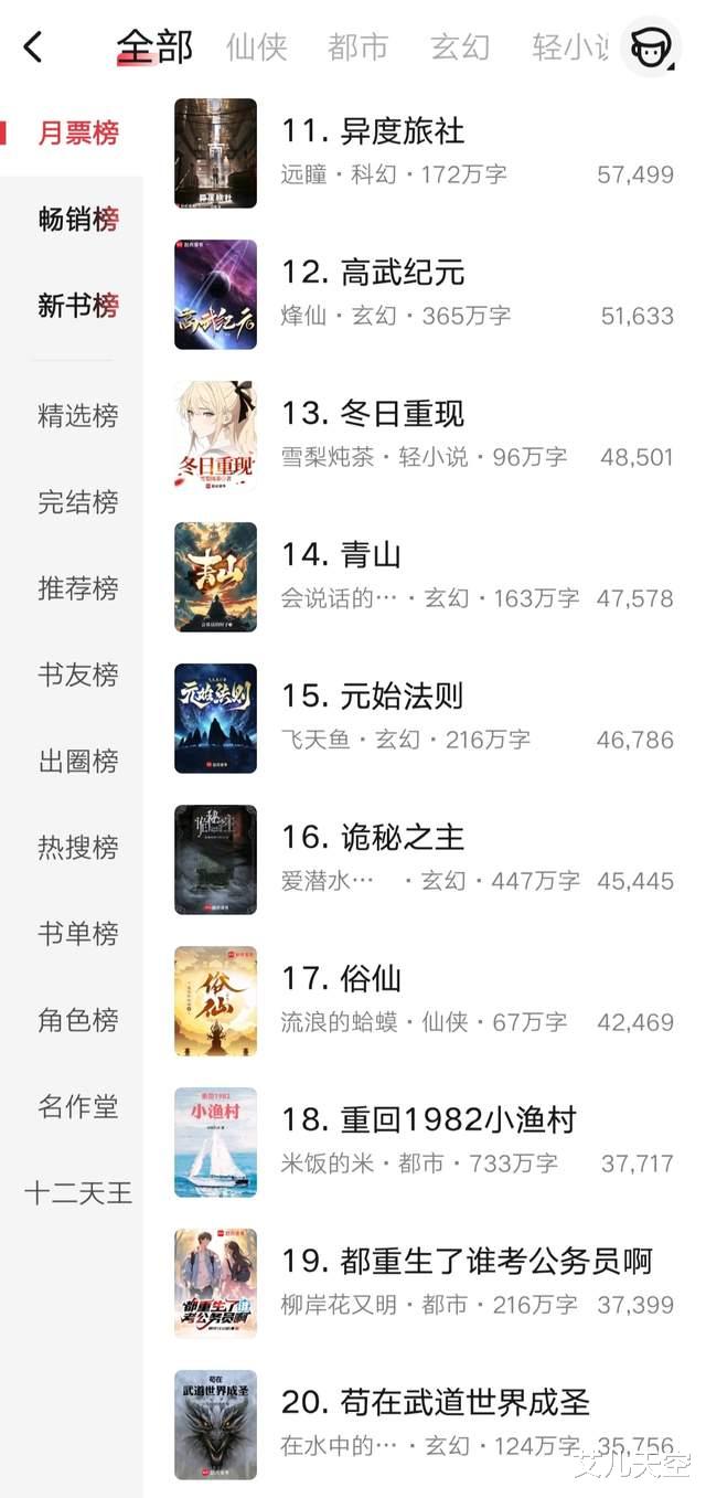 异度旅社、青山、诡秘之主都是上升了一位,苟在世界武道成圣也保持在了第20名的位置,坚持万字更新,均订也在两万以上。
