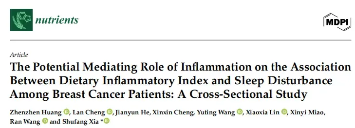 Huang Z, Cheng L, He J, et al. The Potential Mediating Role of Inflammation on the Association Between Dietary Inflammatory Index and Sleep Disturbance Among Breast Cancer Patients: A Cross-Sectional Study [J]. Nutrients, 2025, 17 (24): 3889. DOI:10.3390/nu17243889.