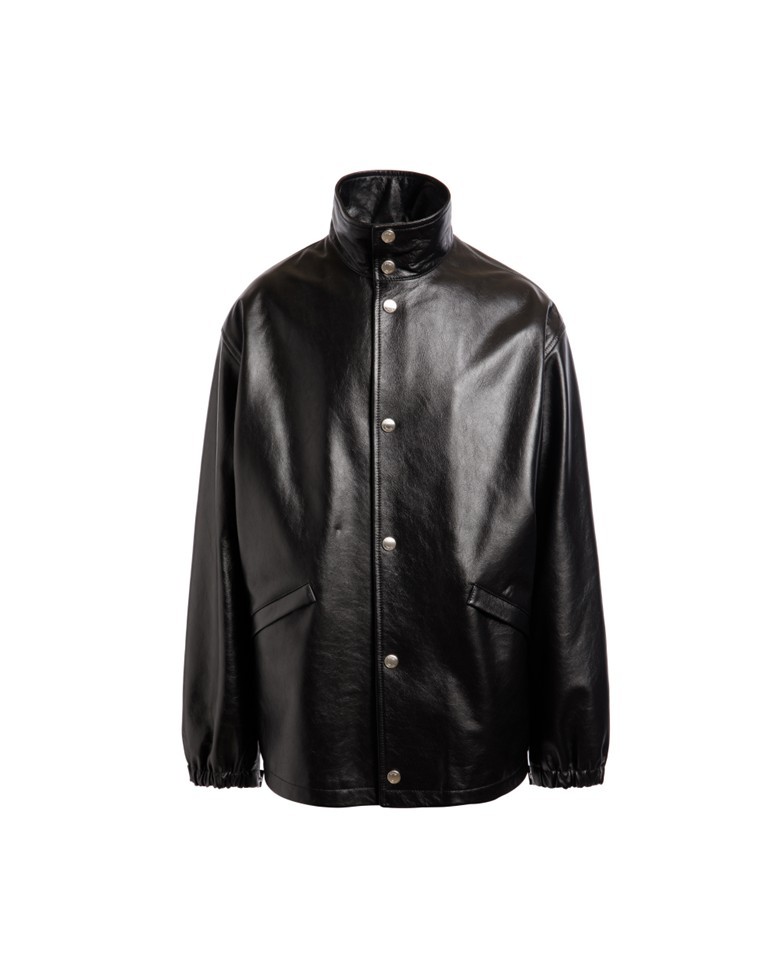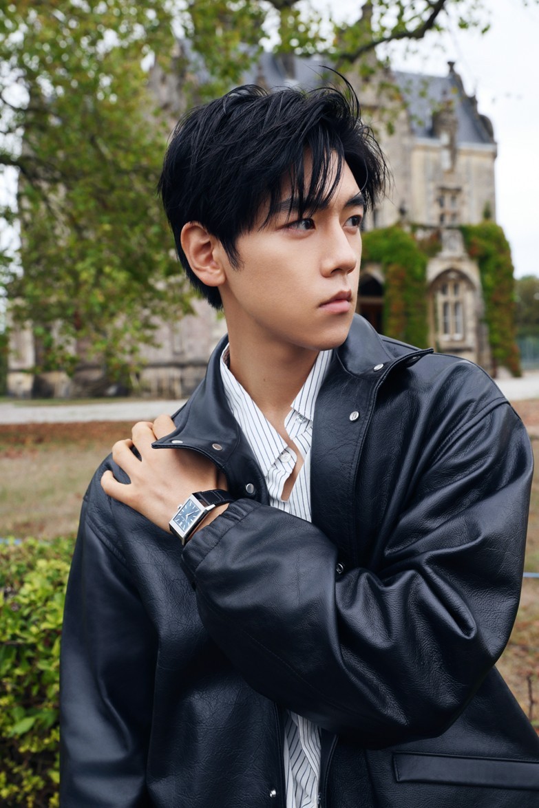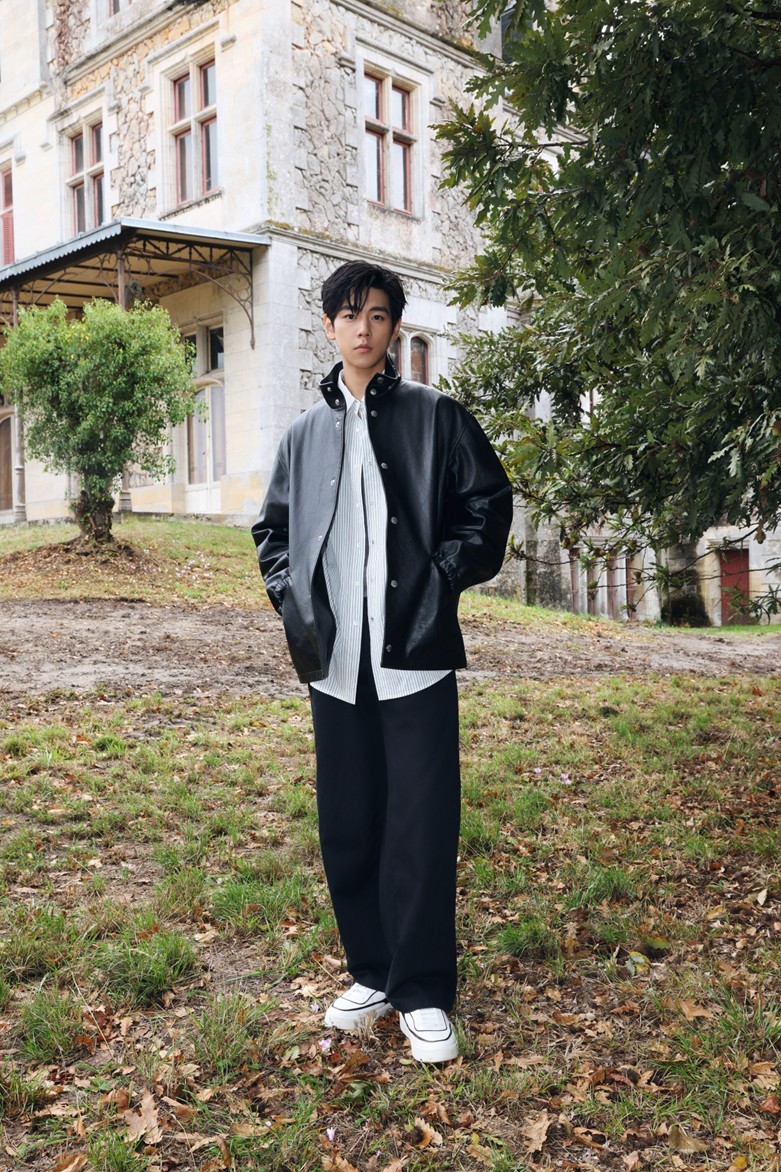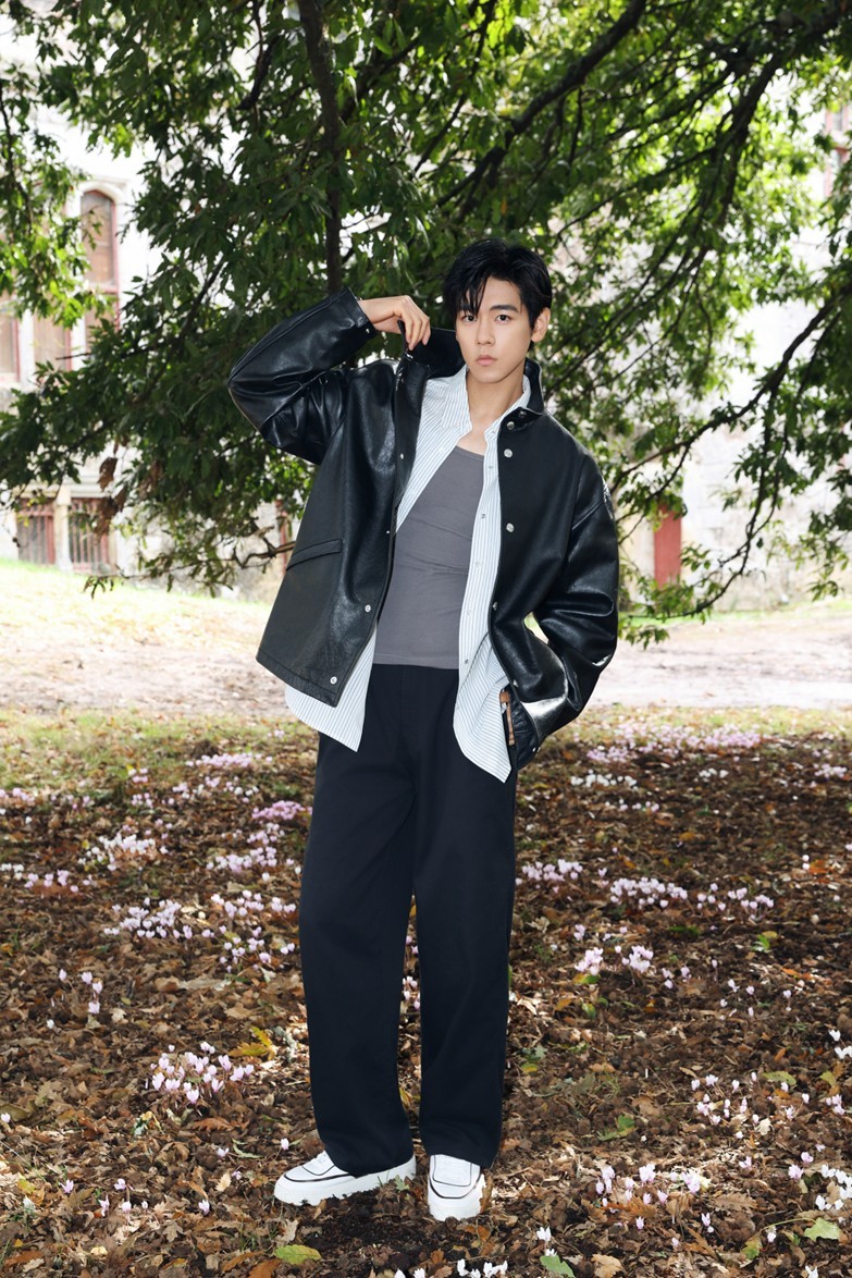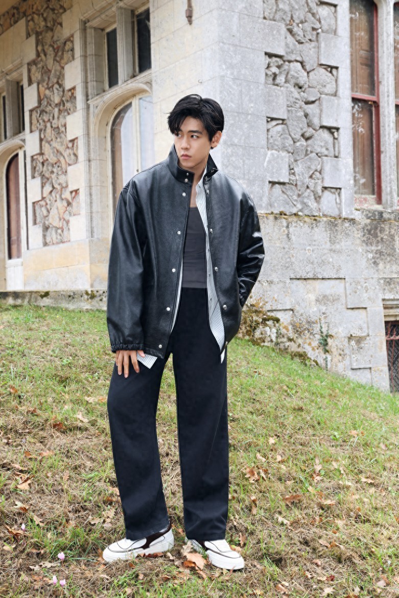 演员夏浩然身着Bally 2025秋冬男士黑色小牛皮高领夹克外套,柔韧皮革塑造挺拔轮廓,搭配Raise运动鞋,舒展律动映衬都市姿态。
