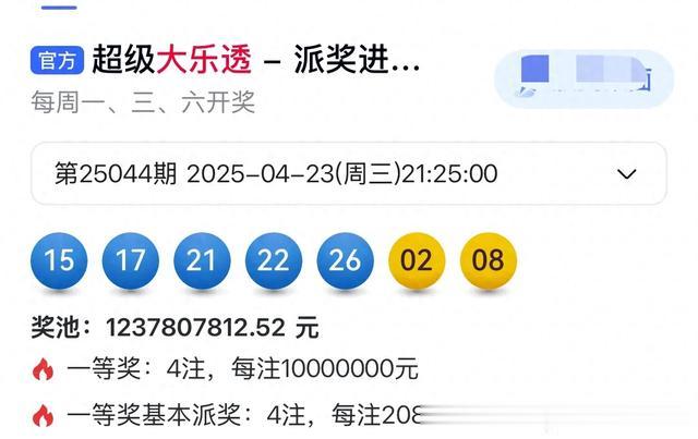 大乐透第25044期开奖结果,一等奖只有4注,不过这4注都参加了派奖活动,多的奖金208万元。可喜可贺。