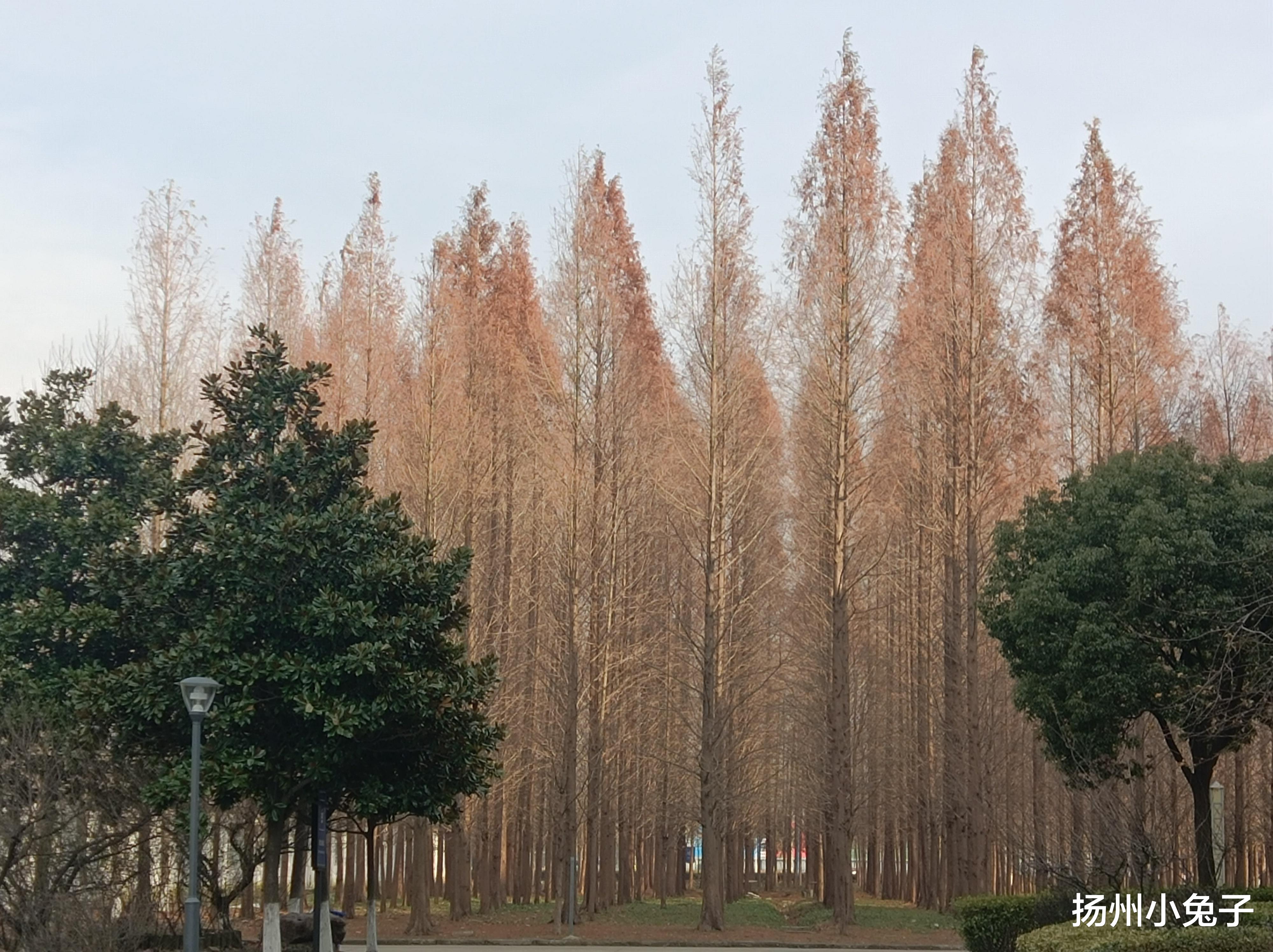 相比银杏树,水杉在扬州的树龄,太短了。短到可以忽略不计。可是,不要忘了“十年树木百年树人”的老话。如今长春路一带的秋天,是欣赏水杉的极佳地。酒红色的水杉树,笔直挺拔。高高的树干,像列队整齐的士兵,向左向右看齐后,不再动弹。树冠在空中,相互勾连,郁郁葱葱。