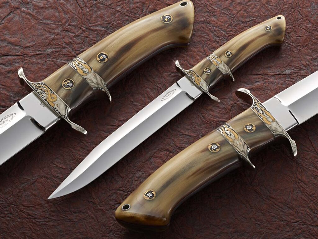 是他的眼光、视角和对美与设计的感知让鲍勃与众不同。很少有他的其他刀像这把大熊一样抓住了这些特质,该刀采用了羊角作为手柄,并由Dan Wilkerson.镶嵌了黄金。